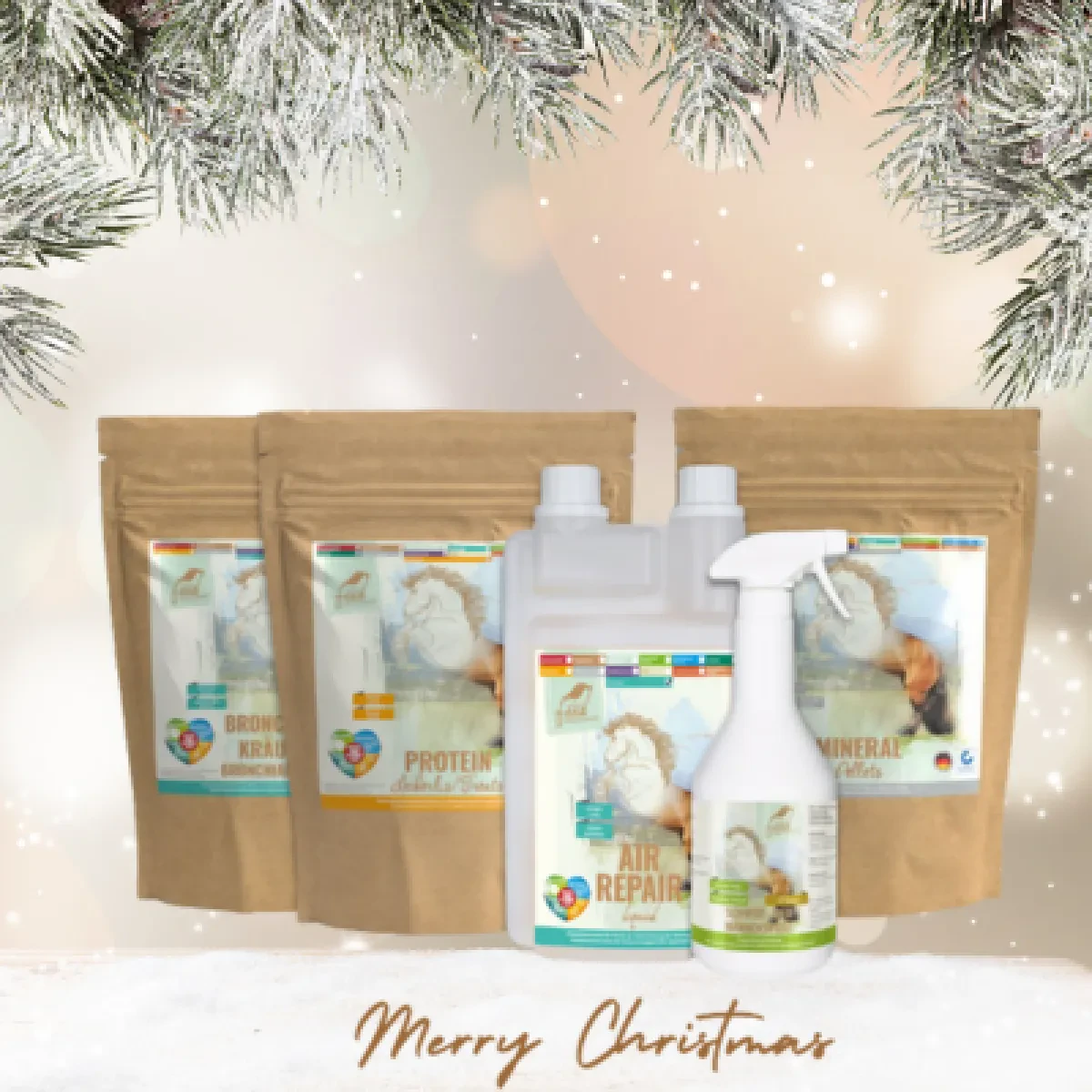 Im Gewinnset enthalten sind die beliebten Bronchialkräuter und Air Repair, die für freie Atemwege sorgen und dein Pferd besonders in der Winterzeit effektiv unterstützen. Ergänzt wird das Paket durch ein hochwertiges Mineralfutter zur täglichen Basisversorgung, die neuen, proteinreichen Leckerlis, die nicht nur gesund, sondern auch unglaublich lecker sind, sowie das Premium Mähnen- & Fellspray, das für seidigen Glanz und gepflegtes Aussehen sorgt – von innen wie von außen.
