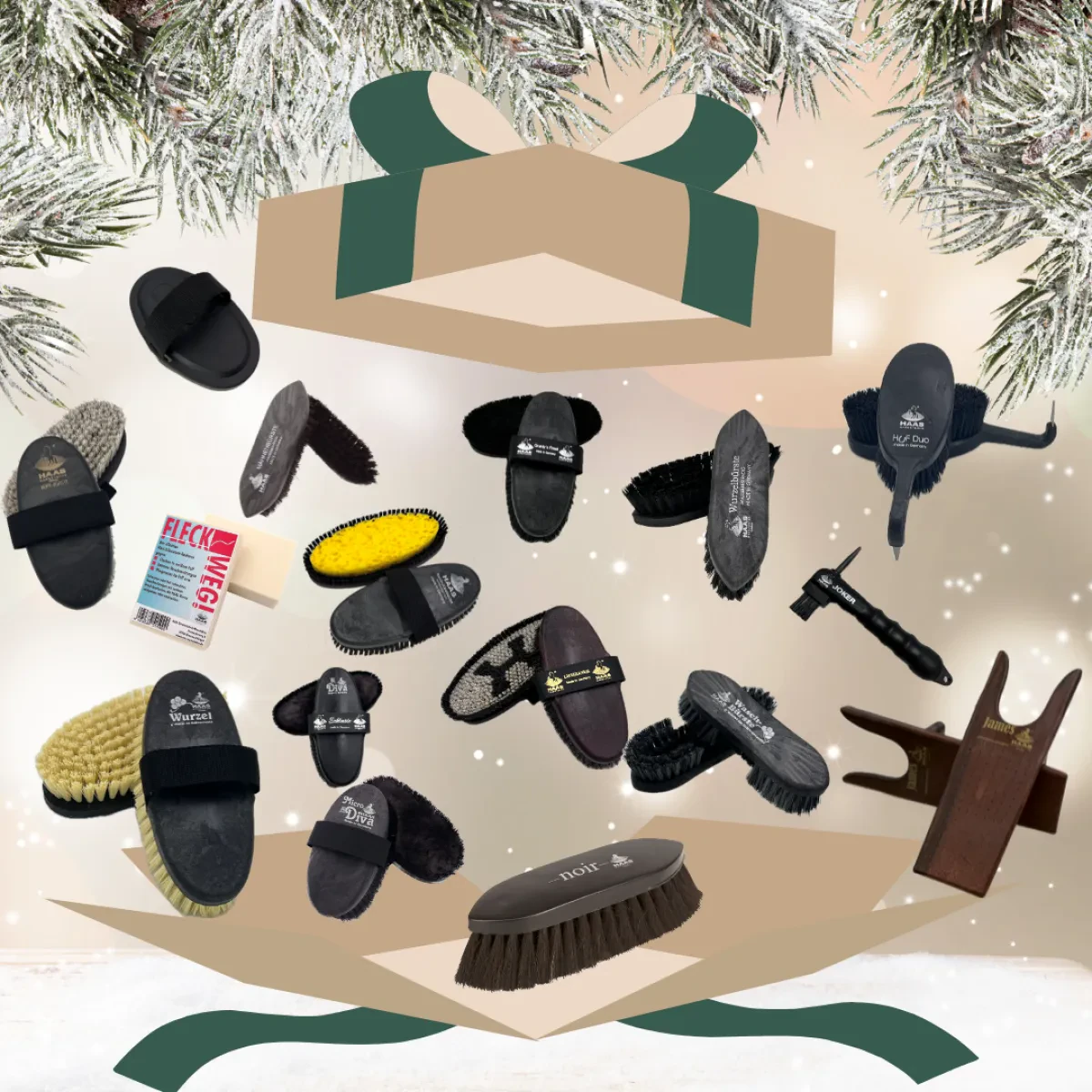 Hinter dem heutigen Türchen verbirgt sich das große XXL HAAS Bürsten-Set – das Rundum-Sorglos-Paket für die Fellpflege deines Pferdes! Von der robusten Wurzelbürste über die Noir Gross und die Lipizzaner Damen Kardätsche bis hin zu den exklusiven Diva Glanzbürsten ist alles dabei, um Schmutz zu entfernen, das Fell zu glätten und für ein glänzendes Finish zu sorgen.
